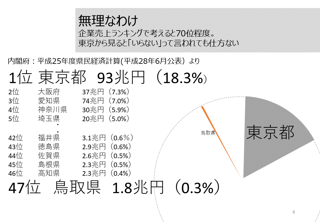 経済活動を表す一つの指標として企業・団体や個人がその年に新たに生み出したモノやサービスの価値を金額に表したものとして都道府県別GDP(県内総生産)がありますが、鳥取県は断トツの最下位の「約1.8兆円」です。豊富な地域資源があり、その地域資源を活用したアイデアはある。お金もある。働く人がいればもっと経済活動が伸びる状況である。しかし、長年の結果が経済活動最下位県という悲しい事実となっています。でも、このままではもったいない。しっかりビジネスをする。しっかり稼ぐことをやる。