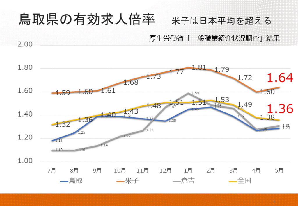 私の会社がある鳥取県西部エリア(米子エリア)は全国平均と比較しても働く人が足りないと言われています。有効求人倍率も1.6倍と高い。明らかな人手不足と言えます。働く人がいれば産業全体は伸びる状況ともいえるでしょう。