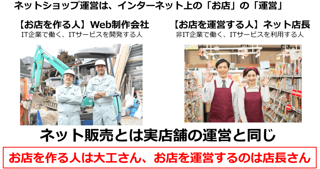 昨今、IT企業が「専門知識がなくてもネットショップが作れるITサービス」を多く提供しています。そして生成系AIの登場で、さらに詳しいIT技術を知らなくても、ネットショップの運営が容易になってきています。そのような世の中になると、ITサービスを上手に活用できる人がより重要になります。