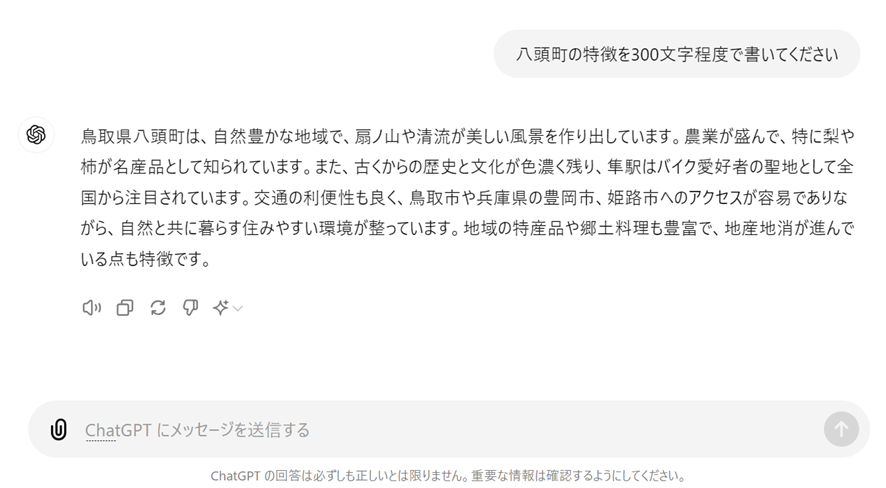 ここでは、ChatGPTが生成したAI生成物「鳥取県八頭町の特徴」を例に取り上げてみましょう。