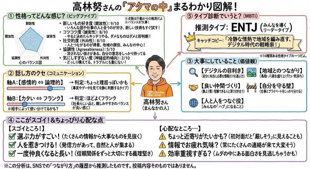 この分析結果からグラレコ風にまとめられた図解には、私の性格特性、コミュニケーションスタイル、そして得意・不得意な領域が、まあびっくりするくらい明確に示されていました。特に印象的だったのは、自分が「推測タイプ」であり、「ちょっと近寄りがたい・・・」という評価でした。キャッチコピーは冷静な情熱で地域を編み直すデジタル時代の戦略家」(苦笑)。弱点としては、完璧さを求めすぎる傾向、そして相手の気持ちを深く考えすぎるあまり、時に空気を読めなくなってしまう自分の姿が、そこに映っていたのです。