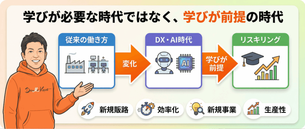 そこに日本全体のズレがあるように感じます。DXだ、AIだ、リスキリングだと言う一方で、そのための学びがまだ日常の行動にまでは落ちていない。だからこそ、学ぶことをもっと普通のこととして語る必要があるのだと思います。
