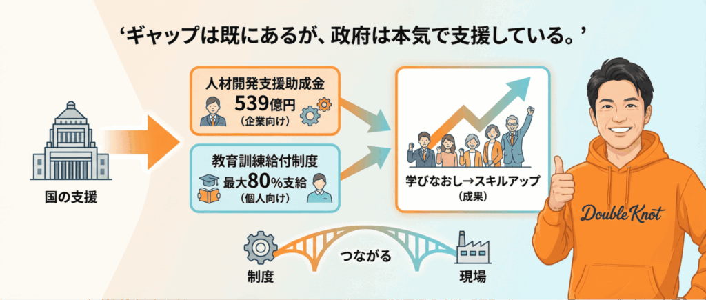 でも、国もその差を放置しているわけではありません。むしろ、かなり大きなお金を入れて、学びなおしを後押ししています。たとえば会社向けでは、厚生労働省の人材開発支援助成金の令和8年度の概算要求額は539億円です。個人向けでは教育訓練給付制度があり、対象講座によっては受講費用の最大80%まで支給されます。つまり、「学びなおしは大事です」と言っているだけではなく、実際に予算をつけて、学ぶ人と学ばせる会社を支えようとしているわけです。