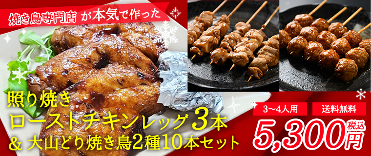 限定販売!国産 特大照り焼きローストチキンレッグ3本+大山どり焼き鳥2種10本セット【3~4名様用】