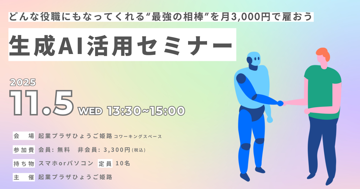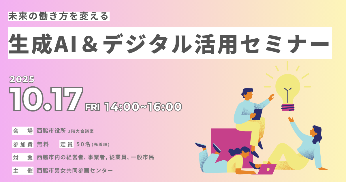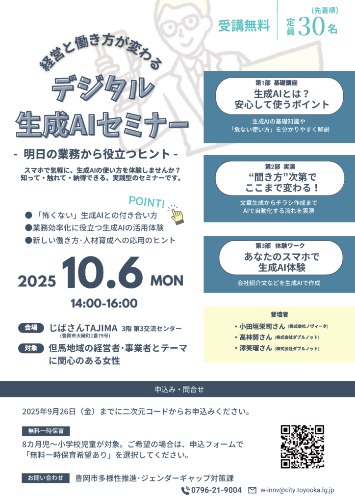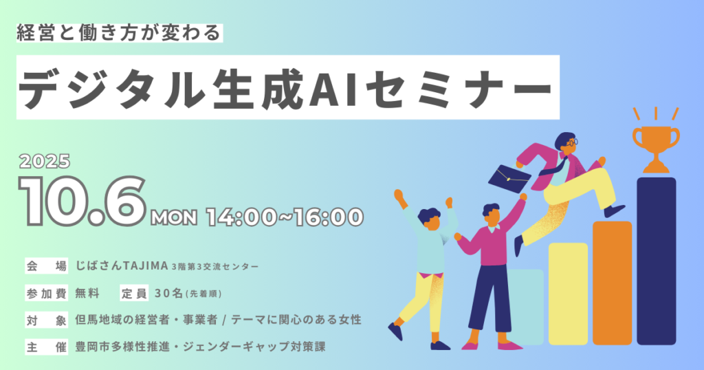 10月6日(火)に開催される、豊岡市主催「経営と働き方が変わる“デジタル・生成AIセミナー” -明日の業務から役立つヒント- 」に、弊社代表の高林と、社員の澤が登壇いたします。