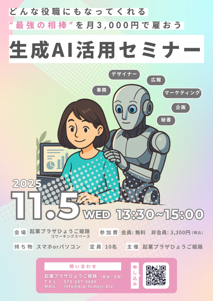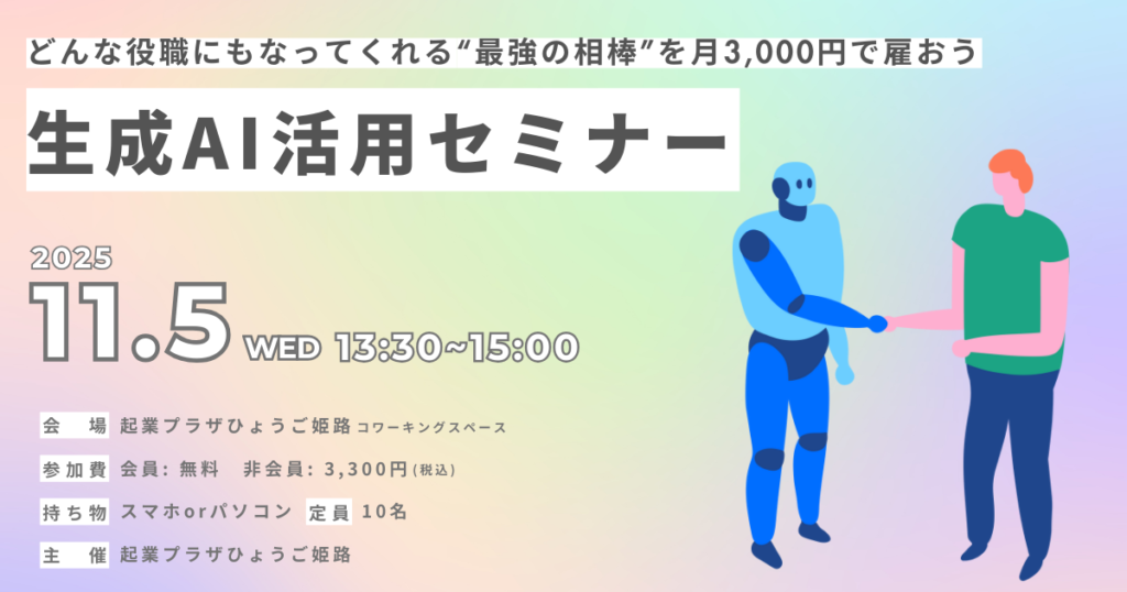 11月5日(水)に開催される、起業プラザひょうご姫路主催「生成AI活用セミナー」に弊社代表の高林が登壇いたします。