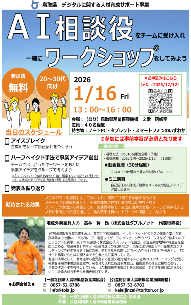 1月16日(金)に開催される、鳥取県情報産業協会主催「“ChatGPT活用セミナー”AI相談役をチームに受け入れ一緒にワークショップをしてみよう」に、弊社代表の高林が登壇いたします。