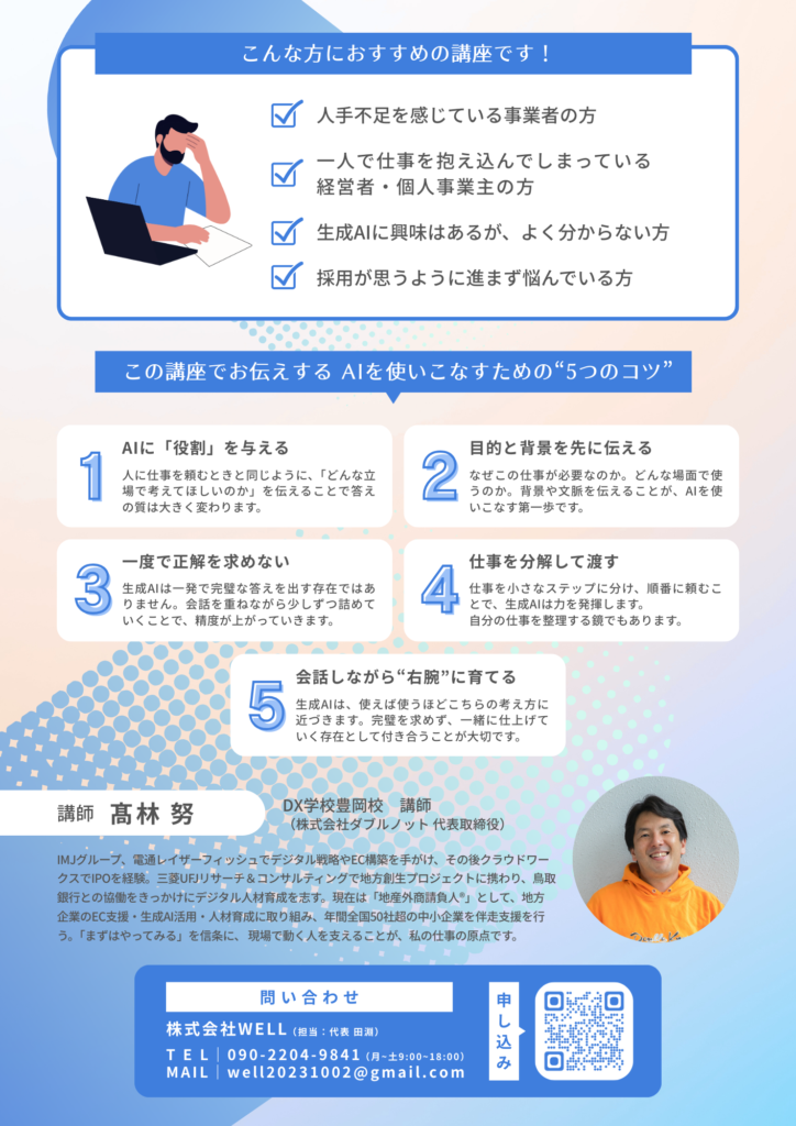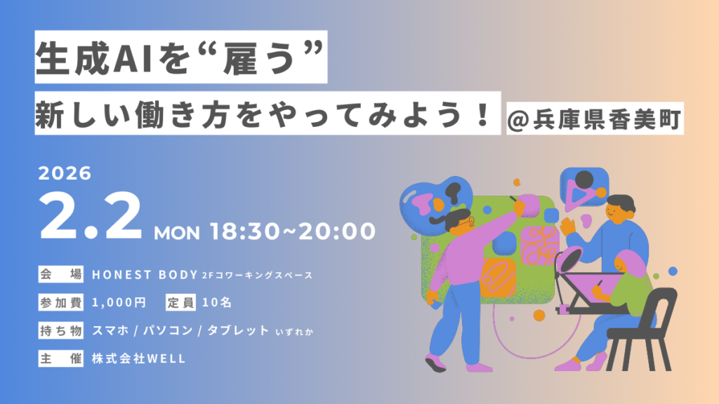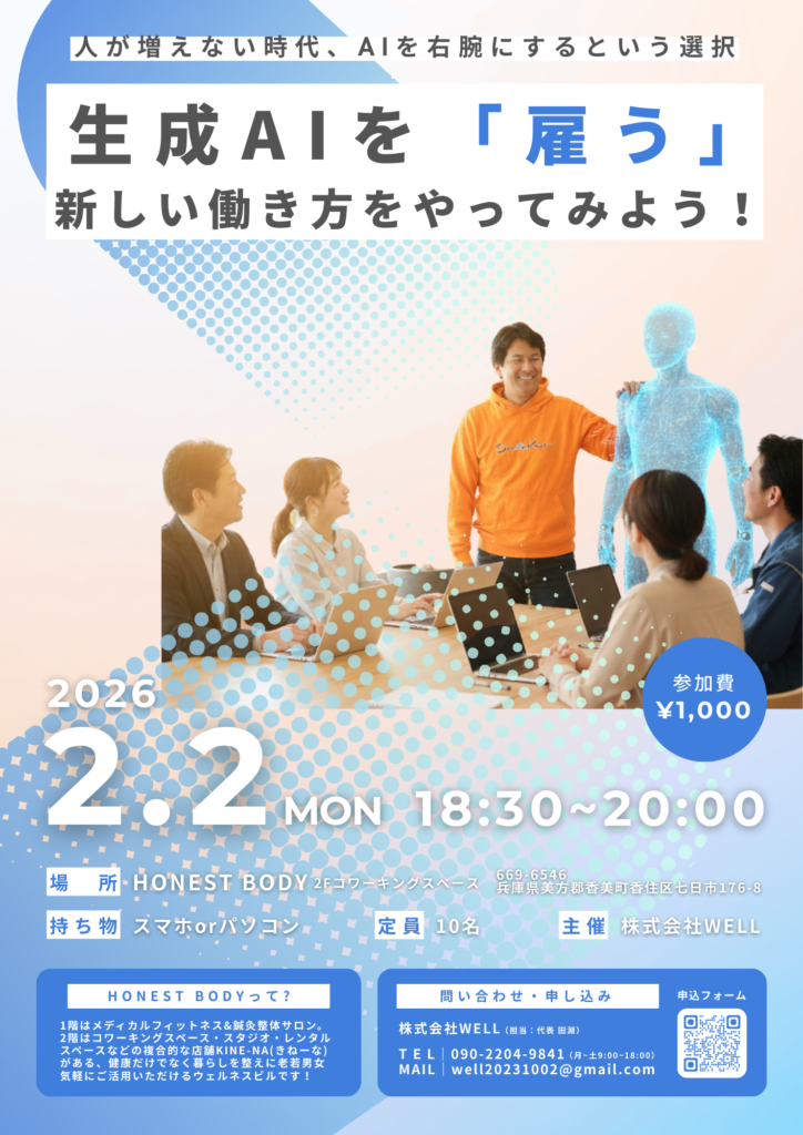 2026年2月2日(月)、兵庫県香美町にて開催される、株式会社WELL主催 生成AI活用セミナー「生成AIを“雇う”新しい働き方をやってみよう!」に、弊社代表の高林が登壇いたします。