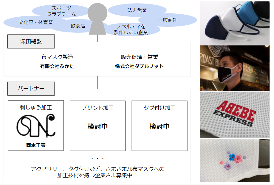 株式会社ダブルノット(本社:鳥取県八頭郡八頭町、代表取締役:高林 努)が八頭町の有限会社ふかた(本社:鳥取県八頭郡八頭町、代表取締役:灘口 茂郎)とともに製造・販売しているマスクのD2Cブランド「深田縫製」に新たなパートナーとして西本工芸(本社:鳥取県八頭郡若桜町、代表:西本 誠)を迎え入れ、「刺しゅうロゴ入りオリジナルチームオーダーマスク」を販売スタートいたします。