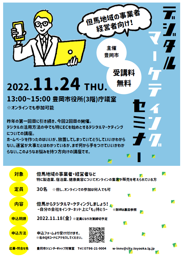 兵庫県豊岡市主催のデジタルマーケティングセミナーに講師として代表の高林が登壇します。 講演「但馬から…